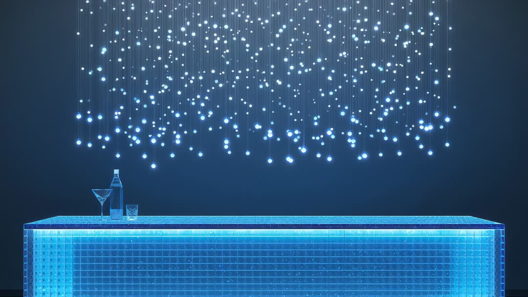 AI Generated Image. Showing descending LED canopy of twinkling bulbs above illuminated blue bar counter with bottle and martini glass. Bulbs cycling and lowering, creating cinematic starfield and ambient neon glow. Camera holding wide frame while subtle reflections animate across glossy counter surface. Motion loop designed for backgrounds, event promos, nightclub trailers, lounge branding, hospitality websites, social media headers. Suggested uses: overlaying text for title sequence, syncing to music for VJ performance, using as hero loop for cocktail menu screens, using as backdrop for product showcase or virtual events. Postproduction tips: providing 4K loop export, creating vertical crop for mobile, boosting cyan highlights while preserving deep navy shadows for dramatic contrast.