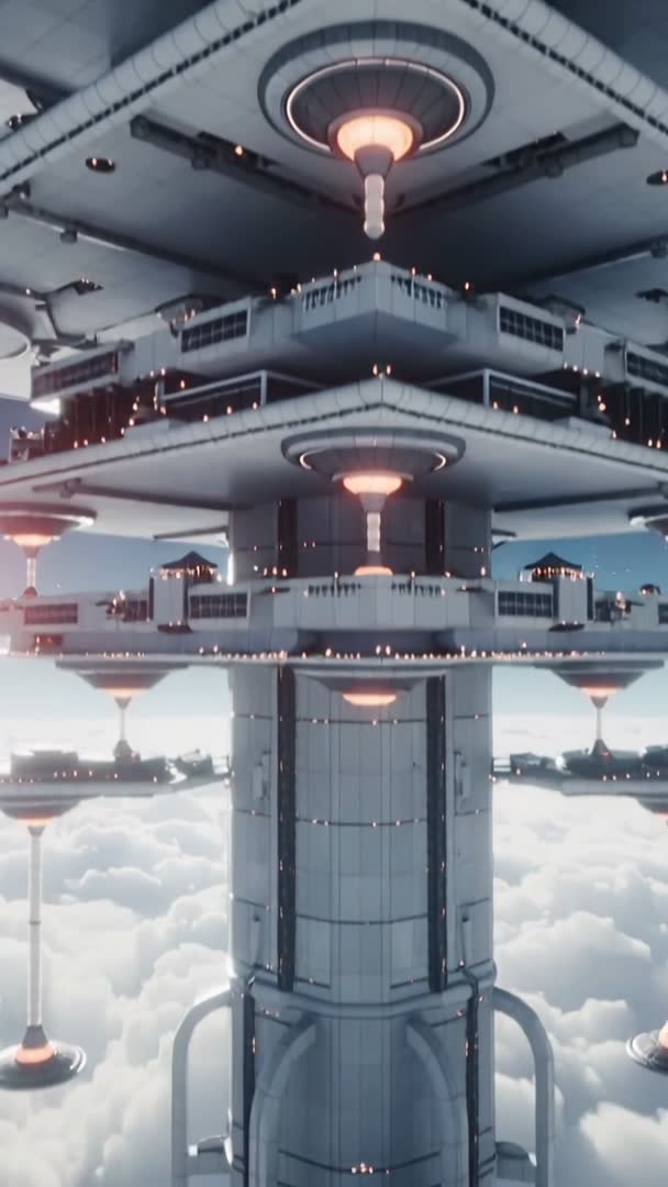 AI Generated Video. Video showing camera starting descent along central tower core rising above dense cloud layer, revealing stacked platforms, spires, and concentric glowing rings. Lighting emitting warm orange accents against cool metallic surfaces, creating cinematic high-tech mood and strong vertical composition. Useful for sci-fi film intro, game cinematic trailer, tech concept showcase, architectural visualization, futuristic city design presentation, and motion design reels. Ideal for vertical mobile ads, social media stories, app background loops, and vertical video banners. Suggestion for use: pairing with slow ambient soundtrack, adding subtle camera shake and parallax to enhance depth, applying teal-orange color grade for cinematic contrast, trimming to 9:16 aspect ratio for mobile-first delivery, and using slow reveal edits to build tension. Licensing fitting commercial, editorial, and entertainment projects seeking dramatic futuristic aerial perspective.