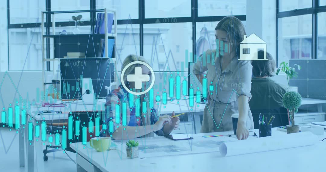 Professionals collaborating in modern office, utilizing digital tools and icons in creative planning. Represents teamwork and innovative design processes, suitable for business articles, modern technology promotions, and office teamwork presentations.