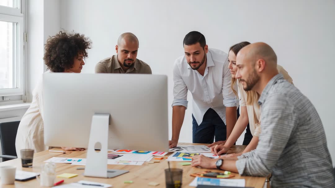 AI Generated Image. Five colleagues in casual dress gathering around large monitor, reviewing colorful design mockups and printed layouts. Team lead pointing at screen while others discussing layout, color, typography choices and user flow. Desk showing sticky notes, color swatches and sketches, suggesting active creative process. Clip suitable for marketing materials, website hero banners, blog posts about teamwork, project management, UX/UI design case studies, agency portfolios and training presentations. Perfect for promoting creative agencies, startup culture, collaboration tools, design workshops and corporate communication about iterative design process. Video clip delivering authentic moment of collaboration, usable in social media ads, explainer videos, onboarding modules and business presentations.