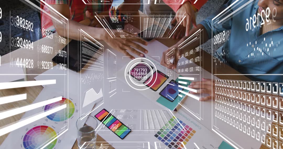 Overhead shot showing hands reaching for color swatches, smartphone, and tablet while augmented HUD overlays display numeric data, charts, and UI wireframes. Designers collaborating around tabletop, testing color combinations, tapping screens, and pointing to sample layouts, conveying fast-paced creative workflow and team decision making. Use for creative agency showreel, UX UI workflow demo, design process presentation, marketing campaign for app or digital tools, online course on color theory, website hero video, social media clip, corporate training module, or product demo reel. Works well with 16:9 video, motion graphics, or overlay animations. Crop for close-up of hands and swatches or pull back for wider collaboration-angle. Add animated callouts or lower-thirds to highlight metrics and color choices. Offer alternate color grade to match brand palette and provide short loop versions for social ad formats.
