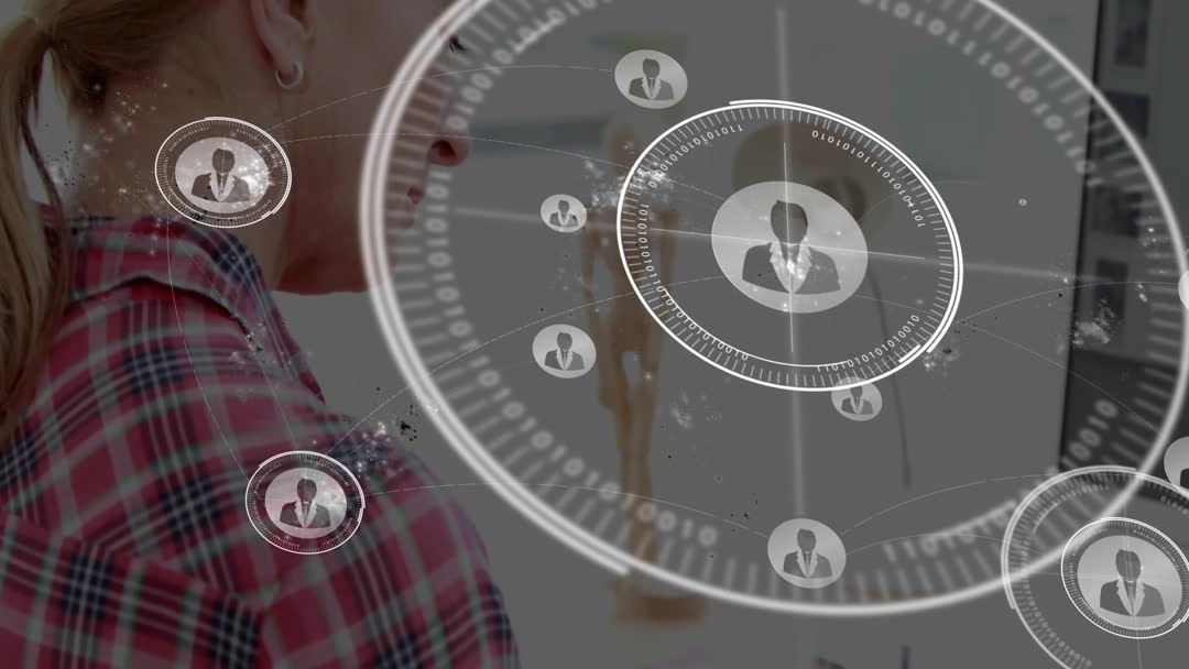 Designer is engaging with digital interface displaying network of user icons. This concept highlights innovation and technology within a creative digital workspace. Ideal for promoting modern work environments, creativity, digital communication, and innovative technological solutions.