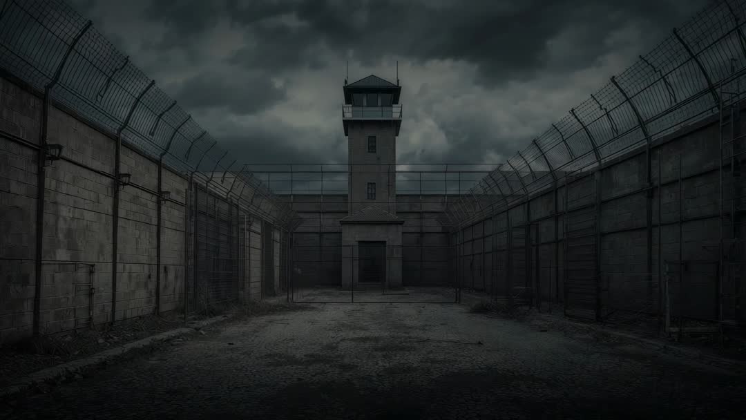 AI Generated Image. Scene showing empty prison exercise yard centered on tall guard tower, flanked by high concrete walls topped with razor wire. Heavy storm clouds moving across sky, casting desaturated light and deep shadows that emphasize isolation and tension. Composition using symmetry and leading lines to draw attention toward watchtower and entrance gate, creating strong visual focal point for headlines or overlays. Useful for illustrating themes of incarceration, surveillance, authority, dystopia, crime drama, or criminal justice discussion. Working well as video background for film and television projects, trailer openers, true crime documentaries, editorial pieces on prison systems, book covers, promotional banners, and presentation visuals. Scene accommodating cinematic crops, title placement along top or bottom, and dramatic color grading or sound design to amplify mood.