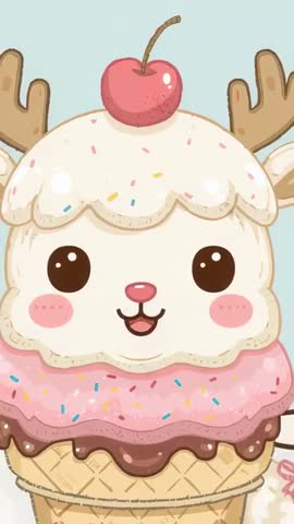 AI Generated Video. Vertical video clip showing dessert reindeer character shifting smile against pale blue background, topped with cherry and small antlers looping gently. Pastel color palette with pink sprinkles and waffle cone base creating cute, whimsical look. Close-up framing and smooth loop making perfect fit for social media reels, TikTok, Instagram Stories, YouTube Shorts, mobile ads. Use for children content, bakery or dessert branding, seasonal holiday promotions, birthday invitations, stickers, packaging, merchandise, app splash screens. Suggested edits: add upbeat music, overlay short promotional text at top or bottom, crop for portrait thumbnails, animate subtle sparkles and confetti to boost charm. Works well for looping banner, animated sticker, short promotional clip.