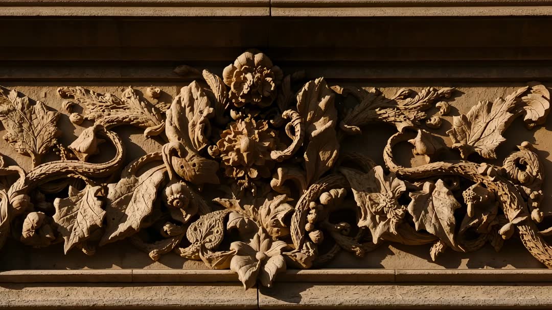 AI Generated Image. This captivating video captures the essence of historic architectural design with a focus on intricate relief featuring rosettes and grapevine motifs on a building facade. Perfect for showing aesthetics of classic artistry, heritage preservation studies, architectural design inspiration, or educational backgrounds culminating intricate construction influences during explorier times.