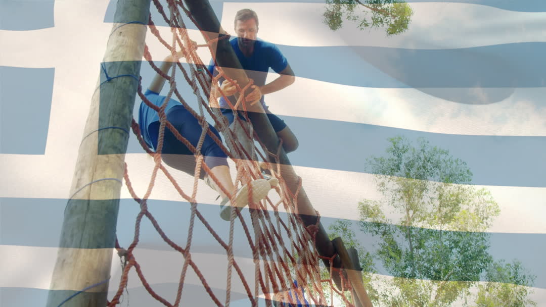 Determined Athletes Conquering a Rope Climb Overlayed with Greek Flag Video