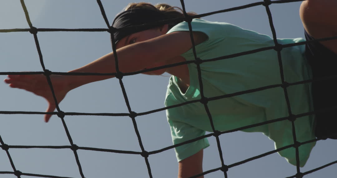 - Determined Girl Climbing Rope Net Outdoor Bootcamp Training