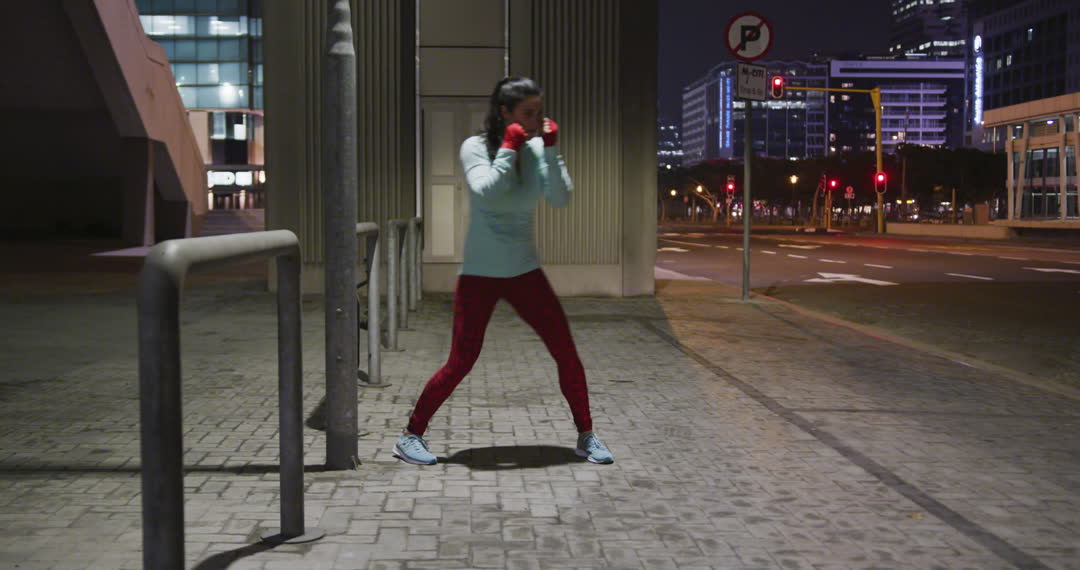 - Determined Woman Practicing Shadow Boxing in Urban Night Scene