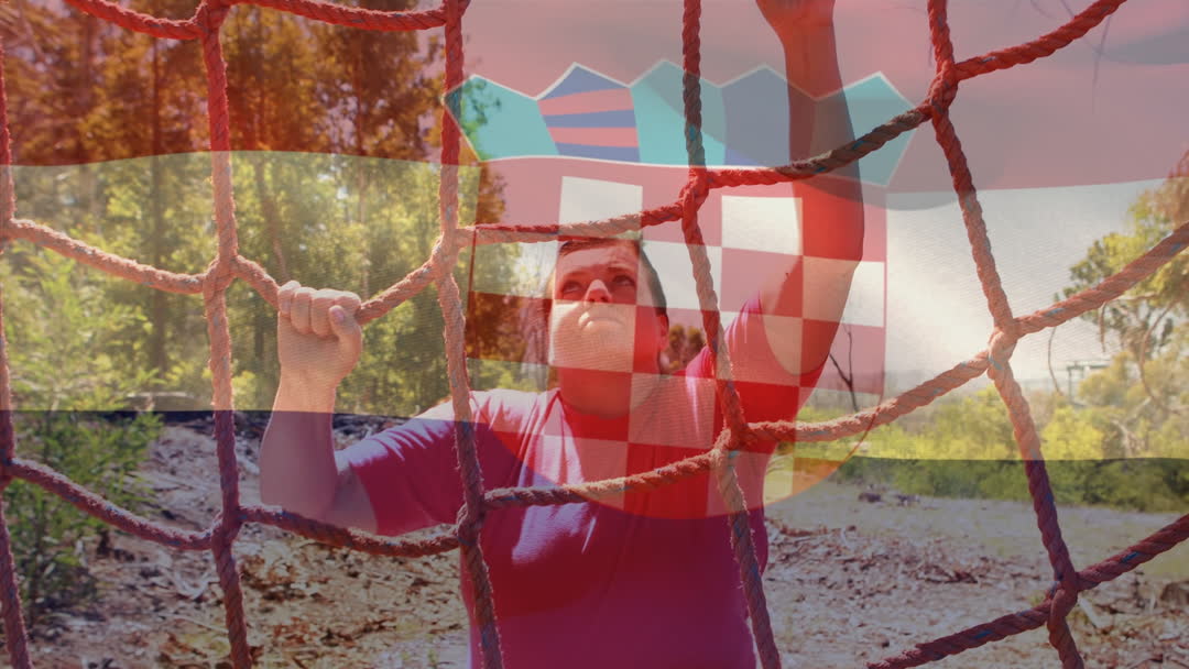 Illustrates a determined plus size Caucasian woman conquering a rope obstacle, underscored by her symbolic connection to Croatia through a flag overlay. This video can be used for advertisements and campaigns focused on empowerment, women's fitness, Patriotic Croatian themes, promoting diversity in sports, or encouraging active lifestyles across a wide audience.