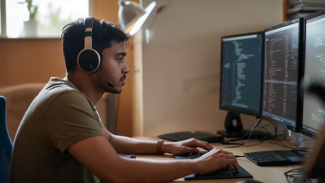 AI Generated Image. Video showing developer working at dual-monitor workstation, wearing headset, typing code and debugging in daylit home office. Cinematic shallow depth of field, profile midshot, natural warm light creating focused mood. Serving for tech company promo, software tutorial, online course, developer recruitment ad, startup landing page, blog header, B-roll for product demo, training presentation. Footage useful for illustrating remote work, programming workflow, agile development, pair programming support, customer support for dev tools. Working well for landscape 16:9 projects for social media, website hero, corporate presentation, stock footage library.