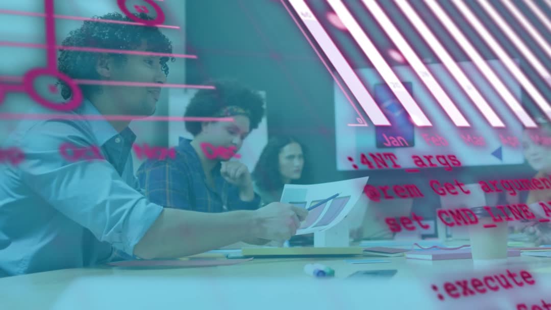 This scene portrays a developer actively assisting the team in a design review. The emphasis is on collaboration with team members attentively analyzing color swatches and evolving charts while a pink code overlay signifies innovation in a modern technological workspace. Useful for depicting teamwork, innovation, modern professional environments, and technology-driven collaboration.