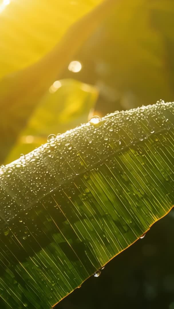 AI Generated Image. Showing dew glistening on banana leaf, golden morning light bathing surface, droplet sliding along central vein. Macro vertical footage capturing fine leaf veins, shimmering bokeh, warm tonal contrast between bright highlights and deep greens. Ideal for calming opener, nature documentary clip, wellness social media reel, meditation app background, organic product commercial, eco packaging hero loop. Providing close-up texture study for botanical blog, educational material on plant physiology, or environmental campaign. Delivering vertical format optimized for mobile reels and stories, loop-friendly composition, soft ambient mood, versatile color grading potential.