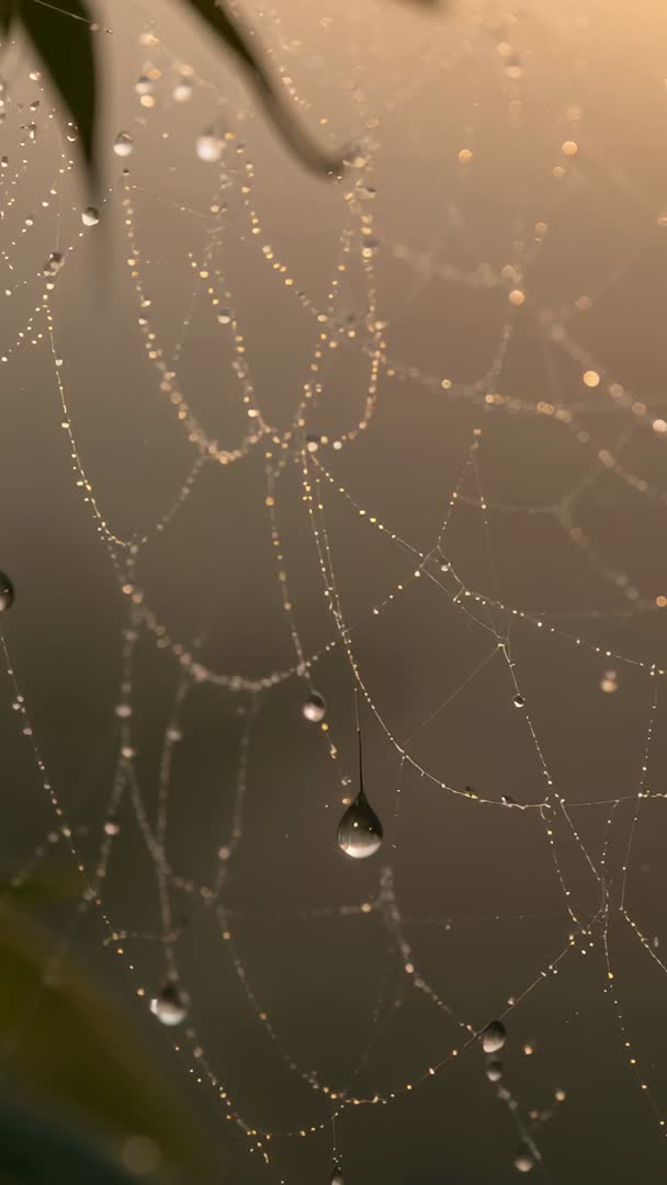 AI Generated Video. Vertical macro footage capturing dew-draped spiderweb with teardrop droplets sliding along fine silk threads under warm golden backlight. Shallow depth of field creating soft bokeh and gentle glow, single large droplet hanging and swaying while tiny beads outlining intricate web geometry. Gravity and light breeze producing slow, organic motion, evoking visual calm and quiet mood. Use in nature documentaries, meditation and relaxation content, social media reels and vertical stories, website hero backgrounds, product videos for skincare or jewelry, editorials on morning atmosphere or scientific features on surface tension and adhesion. Footage providing loop-friendly motion and subtle ambient visuals for background layers in video edits. Color palette offering warm gold and neutral tones, suitable for seasonal, lifestyle, wellness, and mindfulness campaigns.
