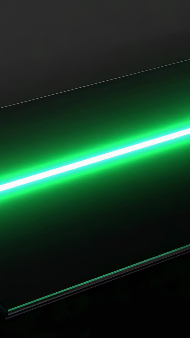 AI Generated Video. Vertical video frame showing diagonal neon green beam activating across reflective black glass slab, metal trim visible along top and bottom edges. Glowing cyan core surrounded by soft green halo cutting across frame, creating strong contrast and sleek reflective highlights. Minimal futuristic mood conveying tech, energy, and modern design. Providing ample negative space for logo overlays, lower thirds, text captions, and motion graphics. Suitable for smartphone product promos, app launch clips, social media stories and reels, website hero banners, electronic music visuals, and trade show displays. Loop-ready short clip enhancing transitions, title sequences, countdowns, or background plates for VJ sets. Color palette emphasizing neon green and cyan against deep black for edgy, cinematic branding and advertising use.