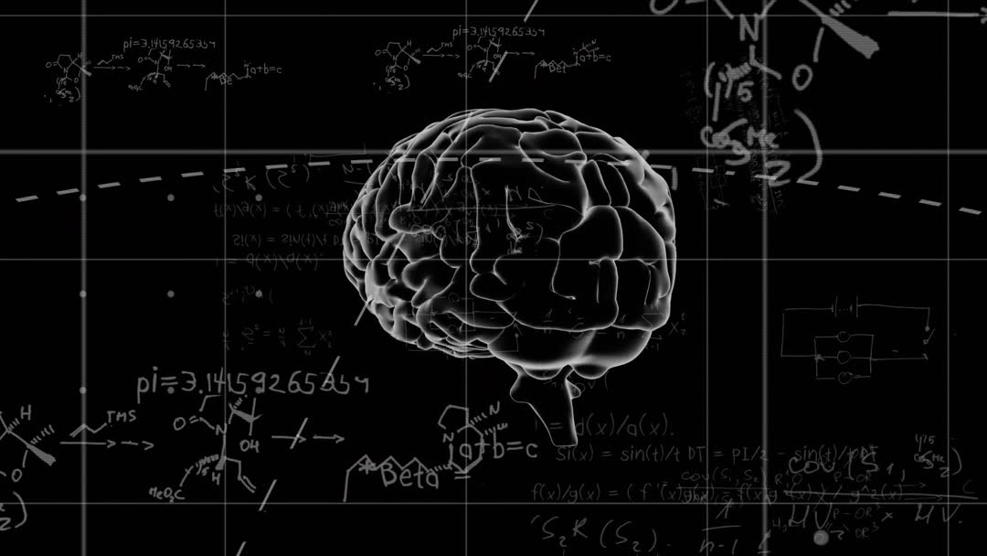 The digital visual captures a preceding 3D brain surrounded by floating scientific formulas and diagrams, creating a futuristic and abstract tone. The video is ideal for use in media discussing neuroscience, scientific research, technology, innovation, educational materials, or as an illustration for cognitive studies displaying the integration of science and digital technology.