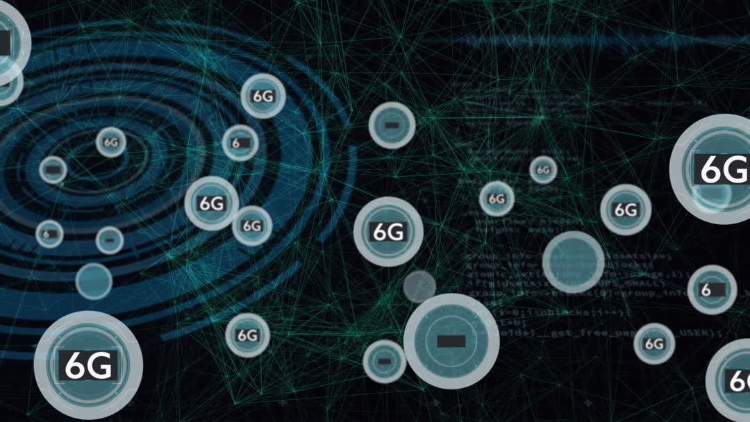 Features a digital representation of 6G technology with multiple circular icons and data processing visuals, portraying advanced connectivity. Useful for illustrating cutting-edge advancements in wireless communication and technology evolution. Ideal for educational materials, technology websites, and industry presentations.
