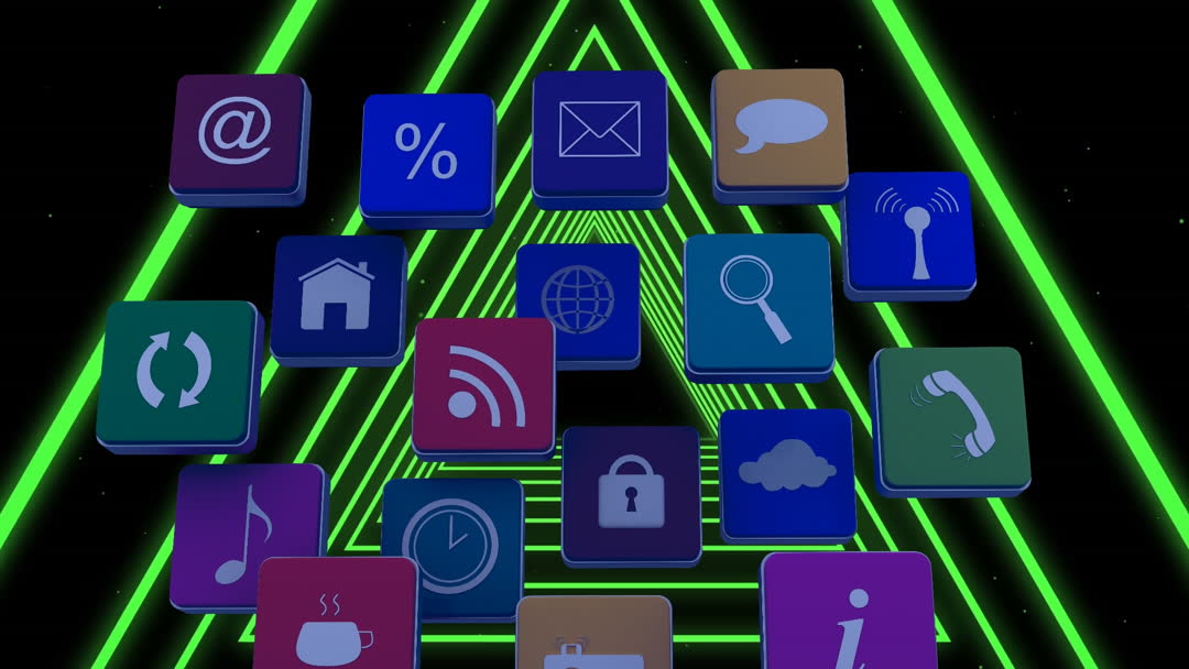 A dynamic digital composition featuring various technology icons overlaid on moving neon triangles, perfect for representing concepts of networking, innovation, and digital communication. Ideal for use in tech-related presentations, digital concept demonstrations, or website backgrounds related to technology and connectivity.