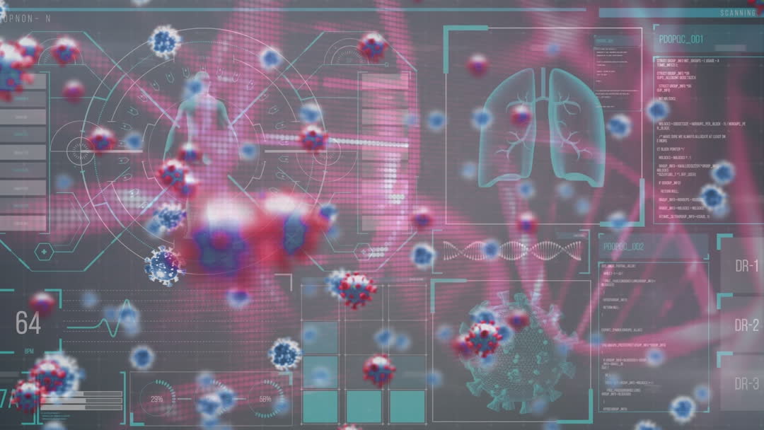 Intricate animation displays COVID-19 virus cells overlaid with a digital data processing interface, highlighting advanced technology in medical research. Visual includes graphics of human lungs, genetic sequences, and data metrics. Useful for presentations on medical technology, pandemic response, or innovative healthcare solutions in global contexts.