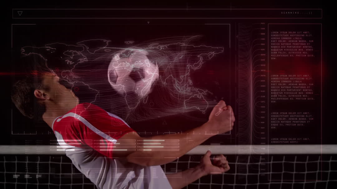 This visual showcases a soccer player in action, enhanced by digital overlays featuring a world map and technological data. Ideal for illustrating themes of sports analytics, technological advancements in athletic performance, and global sporting events. Perfect for use in sports science presentations, promotional materials for technology in sports, and articles on innovation in athletics.