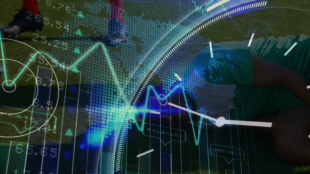 Design features digital elements like graphs, numbers, and a global map layered over a football player lying on the pitch. Represents connection of data analytics with sports industry, depicting injury impacts, performance metrics. Useful for presentations on sports technology advancements, analytical reporting, business projects.