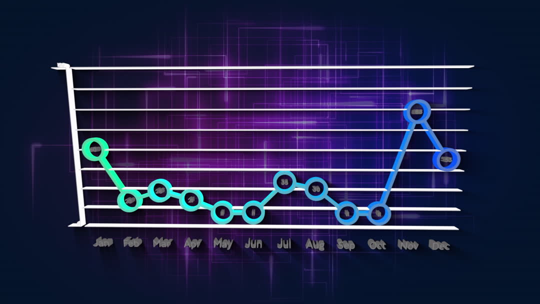 This video showcases a digital dashboard containing a line chart depicting monthly statistics. It presents data in a vibrant graphical format with purple light effects, ideal for illustrating analytical tasks in business, technology, and computer sciences contexts. Perfect for use in reports, presentations, business slideshows, or web design to emphasize modern and dynamic data analysis.