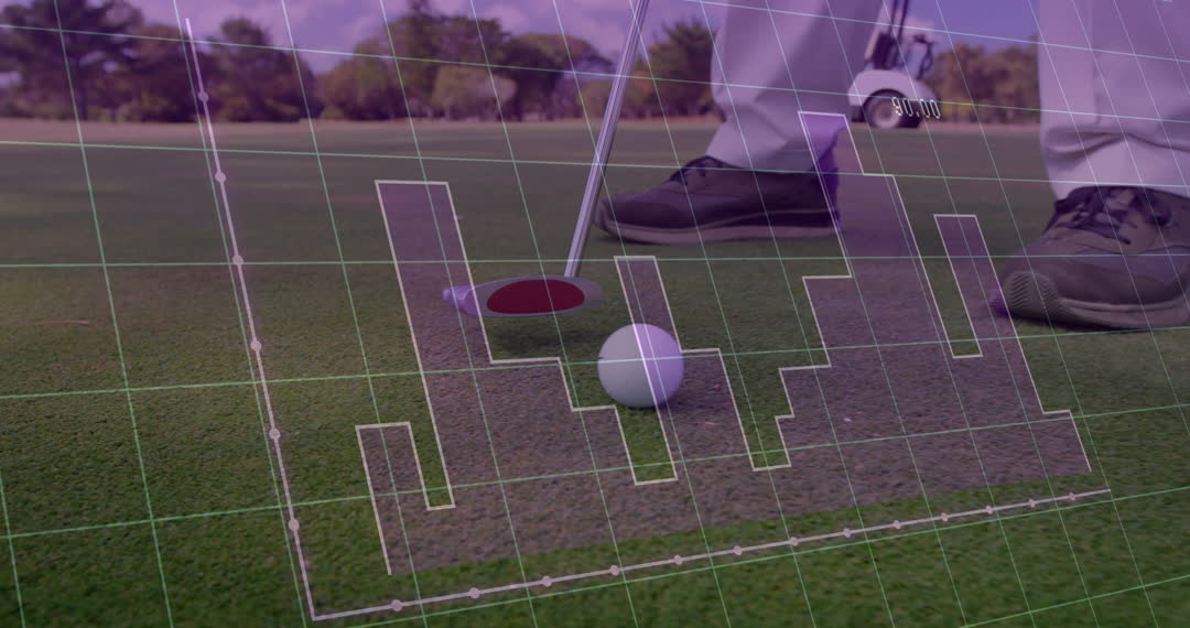 Visualizing integration of data analysis in sports, showing a golfer putting with digital graphs overlay. This is ideal for use in technology promotional materials, sports analytics articles, or digital marketing related to tech advancements in sports.