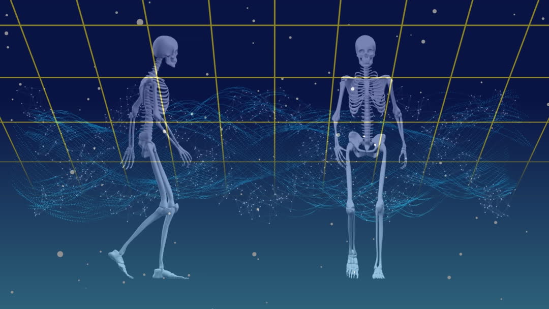 Animation features skeletal figures in choreographed movement against a blue digital landscape grid. Illustrates concepts of data analysis and the intersection of technology with biological studies. Ideal for use in educational materials, tech-related presentations, or visual supplements themed around science, data processing, or technological advancements.