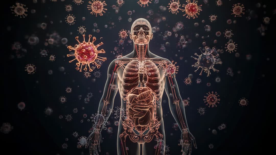 AI Generated Image. A digital visualization shows human anatomical systems surrounded by virus particles, emphasizing scientific phenomena and biological insights related to viral infections. Useful for educational videos, medical animations, and information on epidemic or epidemic studies.