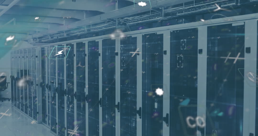 Digital animation in a server room shows ecology icons over rows of server cabinets, symbolizing the link between technology and environmental responsibility. Ideal for technology websites, articles on sustainable computing, or corporate presentations related to data centers and environmental initiatives.