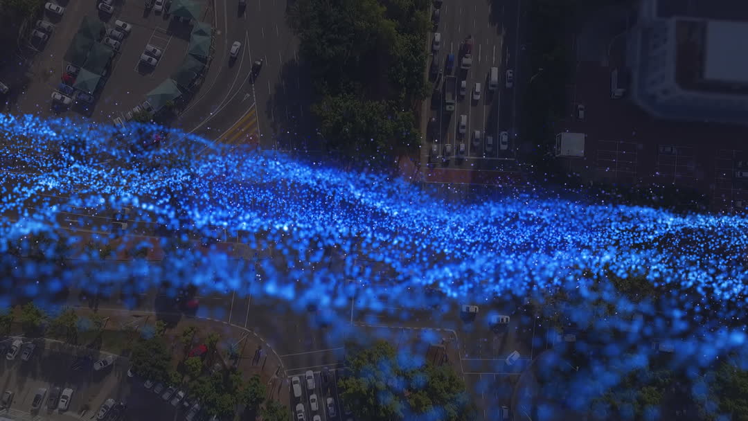 This digital animation shows a flow of blue particles over an aerial view of a bustling cityscape, symbolizing advancements in technology and communication. The combination of urban landscape and digital interface makes it ideal for illustrating themes related to global business, technological innovation, and smart city development. It can be used in industry presentations, tech advertisement, or for educational purposes about digital transformation.