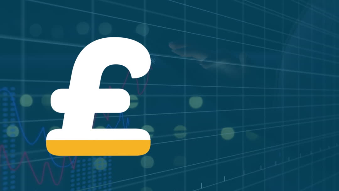 This digital animation depicts a British pound sign filling up with yellow against a backdrop of complex financial data and graphs, conveying a dynamic financial analysis theme. Use in corporate presentations, economic forecasts, or informative content related to global finance and market behavior.