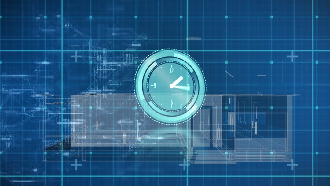 Digital Animation of Clock and House Blueprints with Data Overlay Video