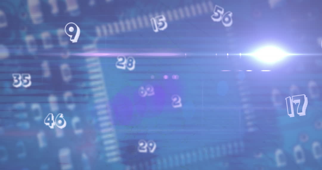 This digital animation illustrates data processing with floating numbers over a stylized circuit board background. Useful for presentations and projects on global business and technological innovation, offering a futuristic visual aid to represent computing concepts and digital data flow dynamics.