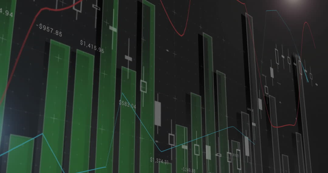 Visual depicting an animation of financial data and stock charts on a digital dark background. Vertical bar graphs and dynamic lines show high activity specializing in financial data representations. Ideal for content involving finance, stock trading trends, economic trends, business analytics, or investment opportunities.