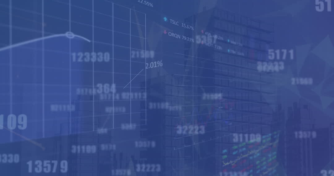 Dynamic representation of financial data processing with blue overlay. Suitable for illustrating economic analysis, business reports, corporate presentation backgrounds, or financial blog posts, highlighting trends and statistics.