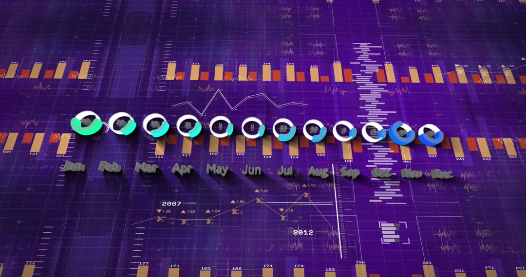 This digital animation presents an array of data charts and graphs highlighted against a vivid purple background, featuring a detailed, technology-inspired design. Each month is symbolized with unique visual markers, making it ideal for presentations in finance, global economy, data science, and technological innovation. It can be used to enhance reports or marketing materials focused on modern finance or tech solutions.