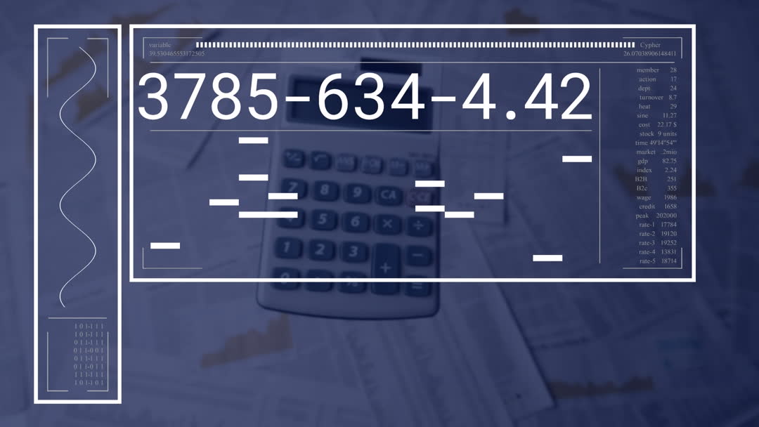 Animated overlay of financial data and statistics paired with an video of a calculator resting on a stack of papers communicates a high-tech approach to business analytics. Perfect for use in videos or presentations on financial analytics, global market trends, accounting software, and modern data processing technologies.