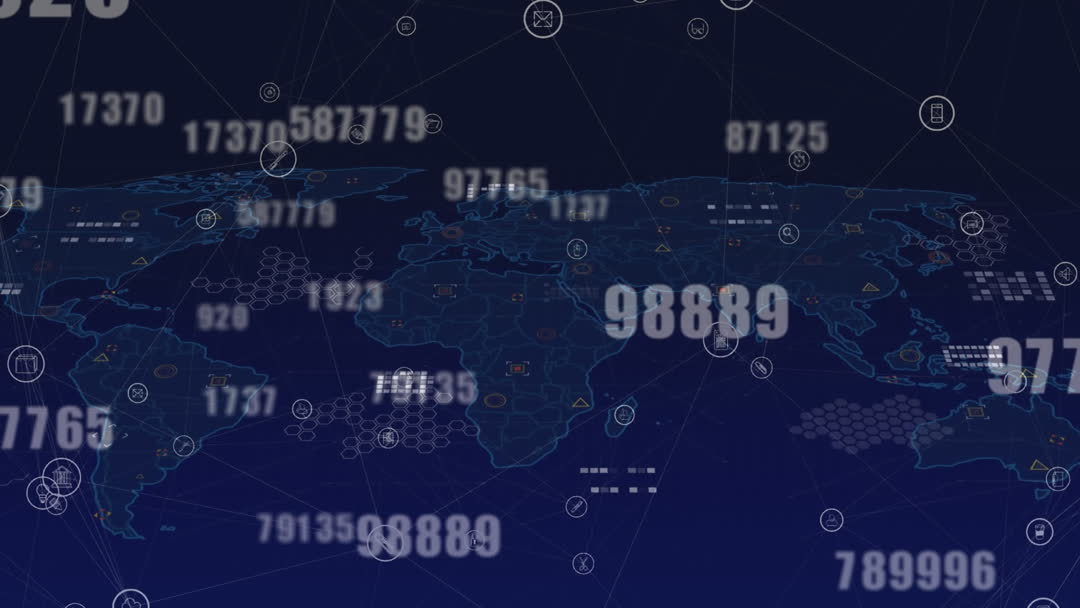 A dynamic portrayal of global data processing emphasized over a world map. Large numbers overlay interconnected regions, symbolizing trends in information technology, blockchain, finance, and cloud computing. Ideal for illustrating digital transformation concepts and innovative technological ideas in presentations, articles, and digital interfaces.