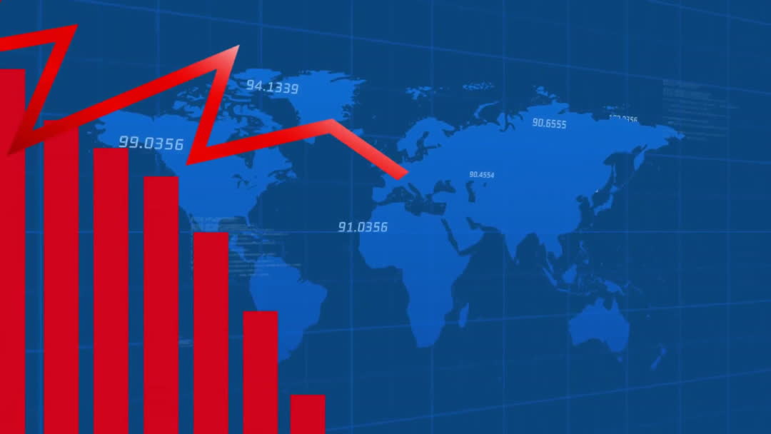 This dynamic visualization depicts a digital representation of financial data processing over a blue world map, featuring red bars and lines that symbolize economic trends. Useful for finance-related presentations, global business strategies, technology solutions, and educational content about economics and data analytics.