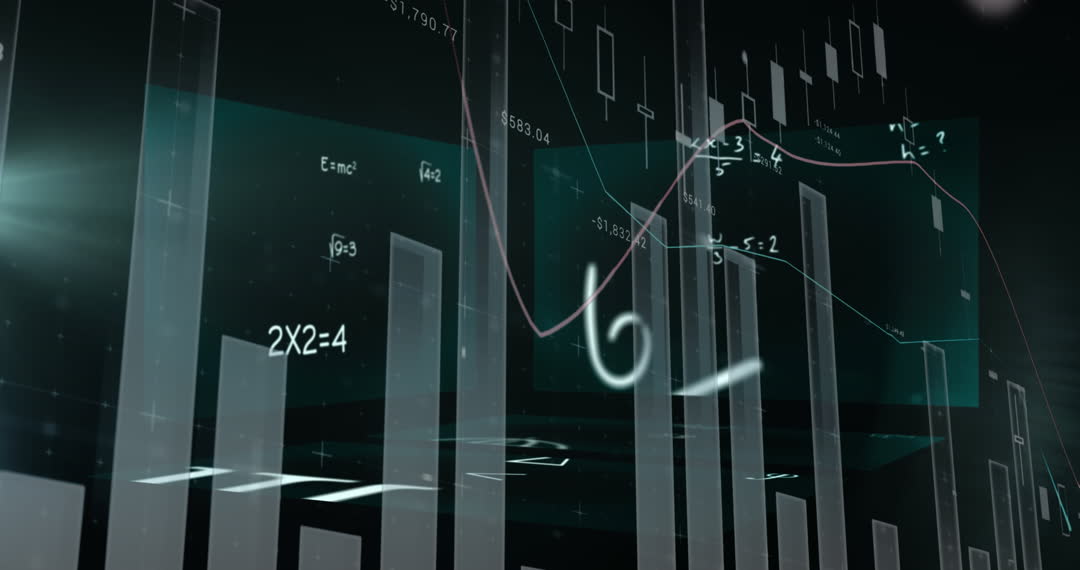 This video depicts an animated representation of mathematical formulas and equations overlaid on a black background, interacting with financial graph-style illustrations. The visual precipitation of equations and charts converges in a futuristic style, making this perfect for educational and scientific presentations, or workshops focused on technology, mathematics, finance, and analytics. Could be ideal for teachers explaining complex concepts or tech companies illustrating data competence.