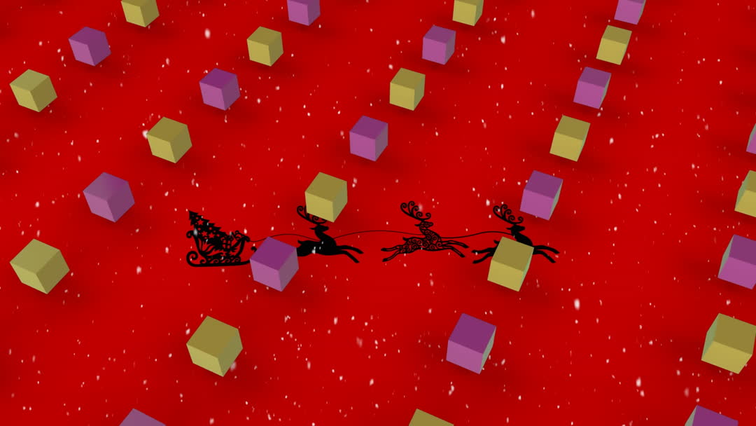 This digital animation features Santa Claus with his reindeer silhouetted against a vibrant red background, with colorful cubes and gentle snowflakes falling. Ideal for holiday-themed promotions, greeting cards, festive decorations, and winter content to capture the Christmas spirit.