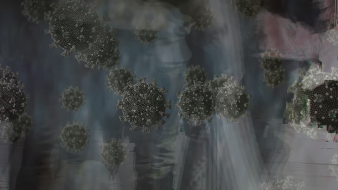Visual depicting animated virus cells overlaying a diverse crowd, emphasizing global health issues and the widespread impact of COVID-19. Suitable for use in health awareness campaigns, educational materials on virus spread, or digital content discussing pandemic effects.