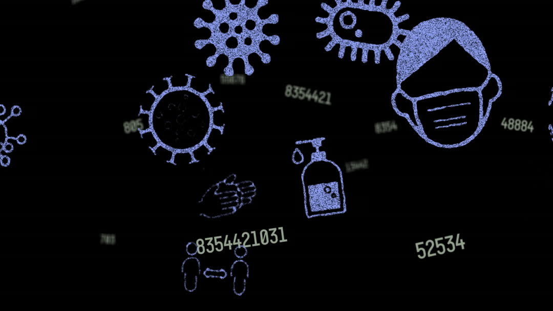 Digital animation showing virus icons and numbers on a black background. The video communicates pandemic-related themes such as health safety with symbols like a face mask, hand sanitizer, and virus particles alongside numerical data. Useful for illustrating education materials dealing with pandemic information, presentations on the economic and social impacts of COVID-19, and editorial content assessing the global health situation.