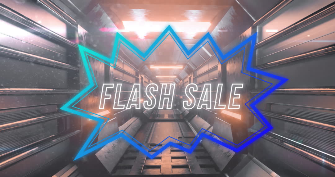 Animation showing text 'Flash Sale' appearing within a dynamic shape overlaying a metallic, futuristic tunnel. Bright lights and a vivid color scheme create excitement. Used effectively for online sales advertisements, retail promotions, and digital marketing campaigns to enhance user engagement and signify a limited time retail offer.