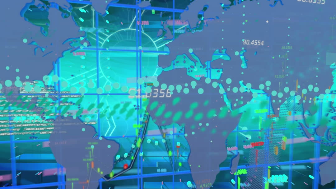 This digital animation features overlays of financial data and graphs on a world map, suggesting themes of global economics and technological connectivity. Elements like numerical values and virtual network lines create a futuristic and dynamic impression. This visual can be utilized in materials related to finance, global economy news, technology presentations, and educational resources on international business trends.