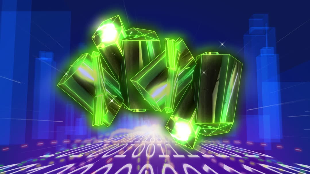 This concept art features glowing green geometric shapes set against cityscape and binary code background, conveying a sci-fi or futuristic tech theme. This can be used in presentations or content related to digital technology, global business, or modern science fiction contexts.