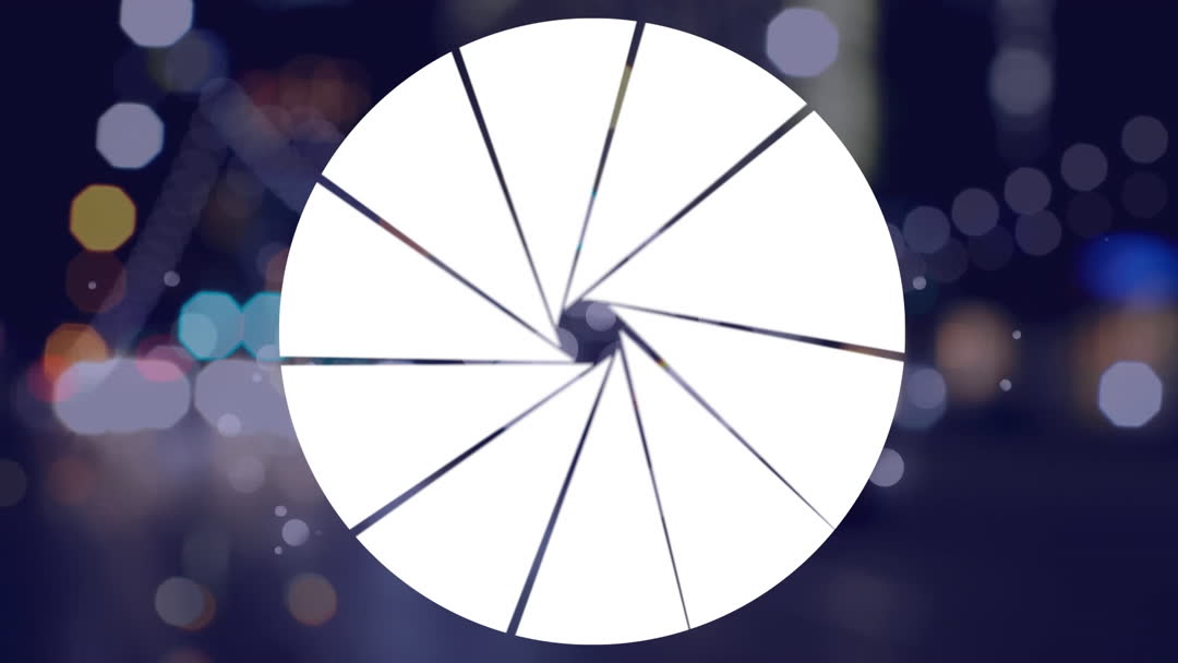 Creative animation showcasing the concept of digital focus and technology. An aperture symbol overlays a blurred background of city lights at night, simulating a sense of data processing and dynamic interaction. Suitable for illustrating technology concepts, digital innovation, and urban data themes. Ideal for use in digital ads, technology workshops, or as a visual element in presentations about modern interfaces and global data networks.