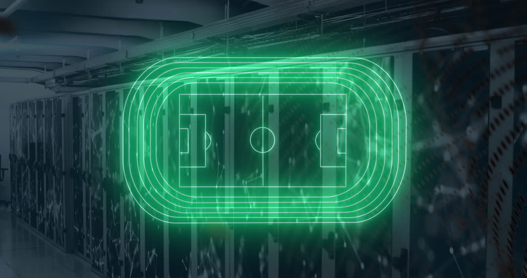 Illustrates concept of modern technology integration in sports with a glowing basketball court hologram overlaying network servers. Useful for tech startups, sports analytics discussions, or showcasing digital transformation in sports industries.