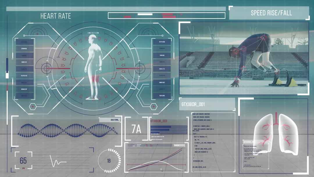 Overlay displays various biometric data including heart rate, genetic markers, and physical parameters. Valuable for presentations on health technology advances, sports science research, and improving athletic performance. Useful in illustrating concepts of health monitoring and biometric evaluation in competitive sports.