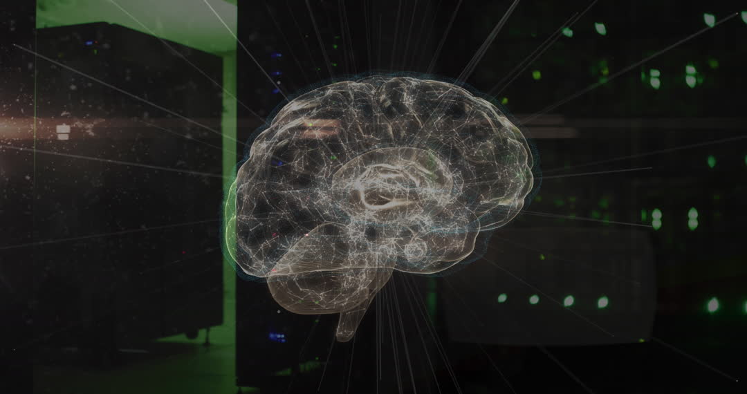 A digital illustration overlaying a translucent brain network onto a modern server room with green lighting. This video symbolizes the merging of human intelligence with digital technology, ideal for depicting concepts in artificial intelligence and digital transformation. Useful for technology websites, AI research articles, and presentations on networking, computing, and futuristic innovations.